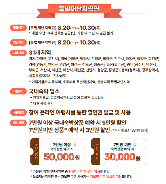 최근 재난 피해를 입은 지역에 대한 관광 활성화 차원에서 특별재난지역 전용 할인권이 추가로 제공됩니다.